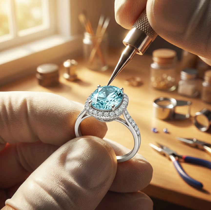 The final step is a personal quality review, where we hand-inspect every setting and stone to ensure a flawless finish.
